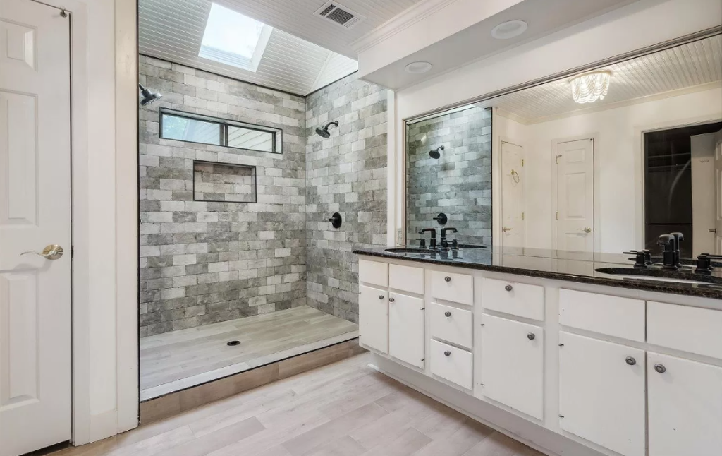 This property flip took a dated house and transformed it into a beautiful contemporary space. A main focus of the renovation, the bathroom transformation turned inefficient, outdated space into a luxurious spa-like retreat featuring high-end finishes and timeless design.